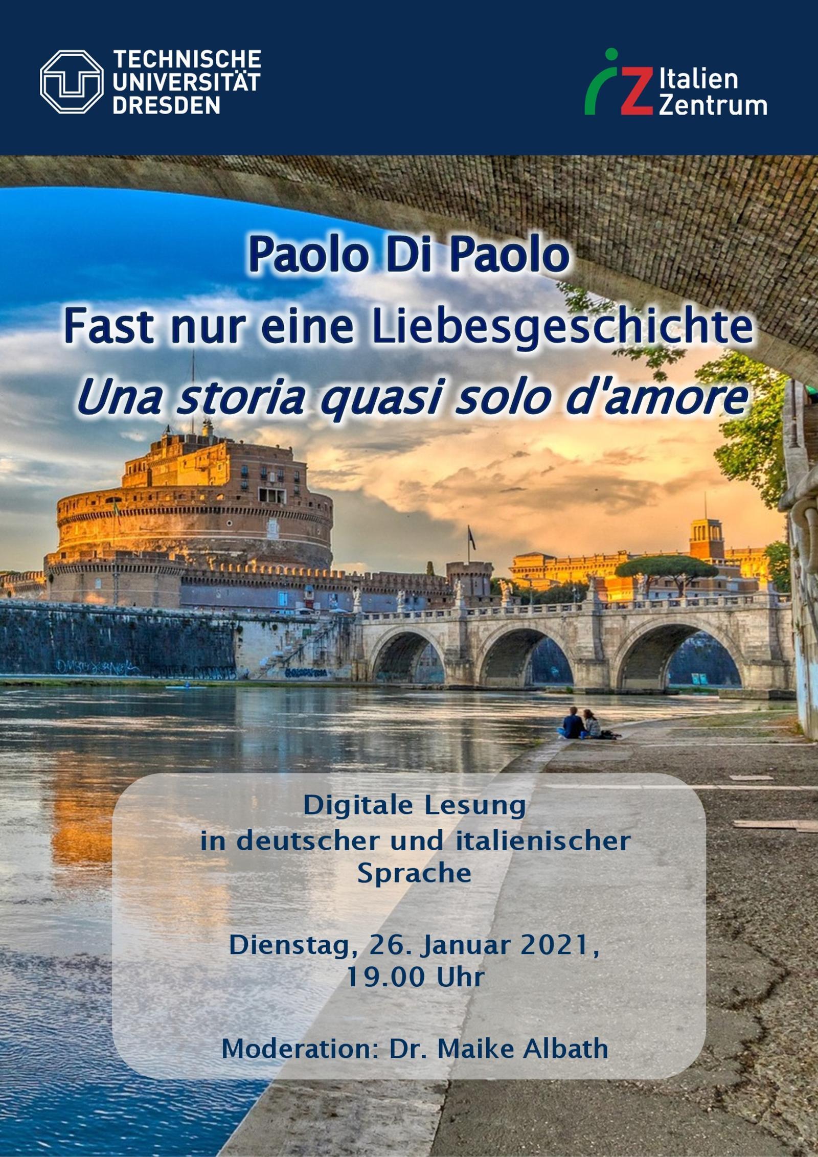 Am 26. Jan. 2021 wird der italienische Autor Paolo Di Paolo seinen Roman Fast nur eine Liebesgeschichte im Rahmen einer Online-Lesung vorstellen. Die Veranstaltung wird in deutscher sowie italienischer Sprache stattfinden und von der Literaturkritikerin und Journalistin Maike Albath moderiert werden. Nähere Infos folgen!